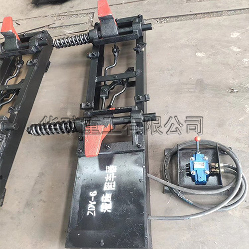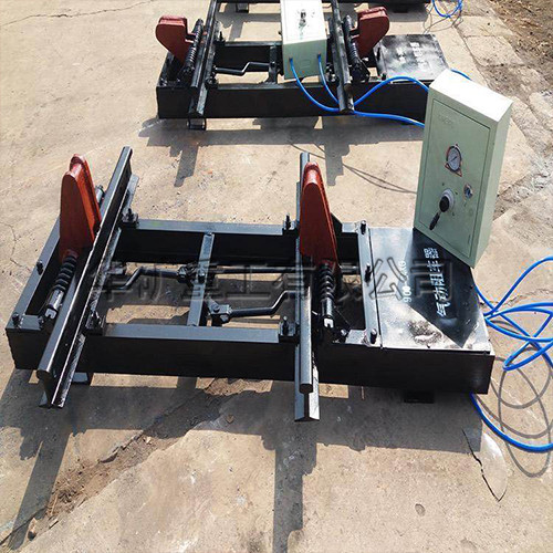 氣動阻車器涉及煤礦井下運(yùn)輸機(jī)械技術(shù)領(lǐng)域,氣動阻車器由兩根平行的固定支座和阻車桿、前支承座、后支承座及腳踏連動裝置組成,單軌阻車器固定支座的兩端分別固定在前支承座和后支承座上,阻車桿置在兩個(gè)固定支座之間,連接在兩個(gè)固定支座之間的轉(zhuǎn)軸穿過阻車桿的中部,阻車桿呈上端小下端粗重狀,自然狀態(tài)下,其上端翹起,腳踏連動裝置由腳踏板、拉線和撥桿組成,撥桿的中部鉸接于兩個(gè)固定支承座之間,其上端通過拉線與腳踏板連接。